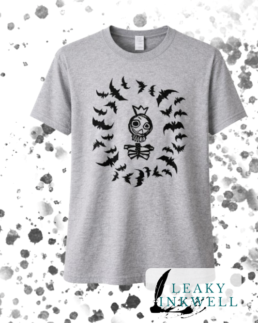 Hand Printed T-Shirt - Grey Skeleton King With Bats